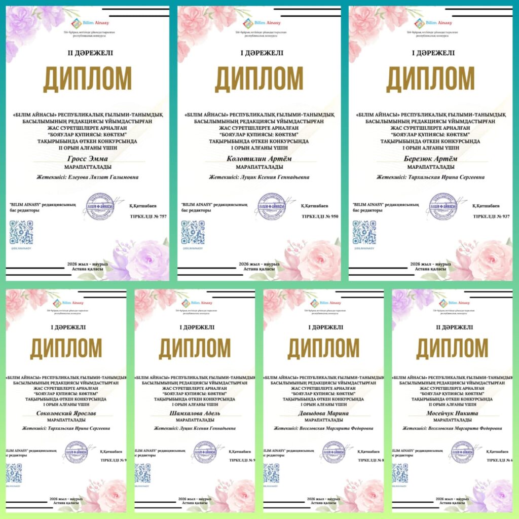 🔹️ I дәрежелі дипломмен марапатталғандар: Давыдова М. (жетекшісі — Веселовская М.Ф.), Тюлюбаев Р. (жетекшісі — Саворовская Т.С.), Соколовский Я., Шамхалова А. (жетекшісі — Луцик К.Г.), Березюк А. (жетекшісі — Тархальская И.С.).