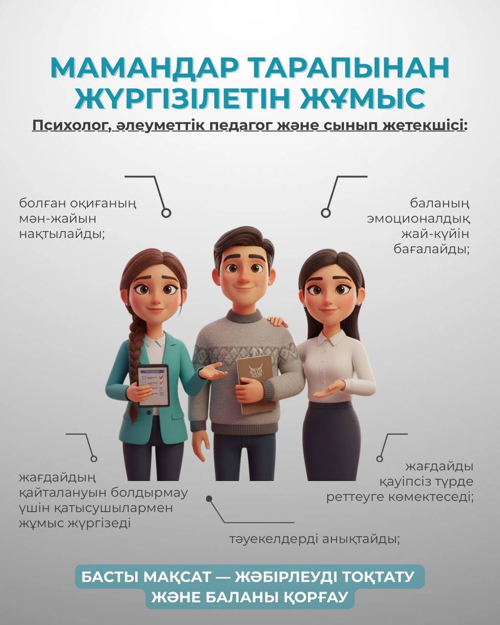 • Жоғарыда берілген инфографикада — әрекет ету алгоритмі, құқықтық шаралар және ата-аналарға, педагогтер мен мамандарға арналған нақты ұсынымдар ұсынылған.